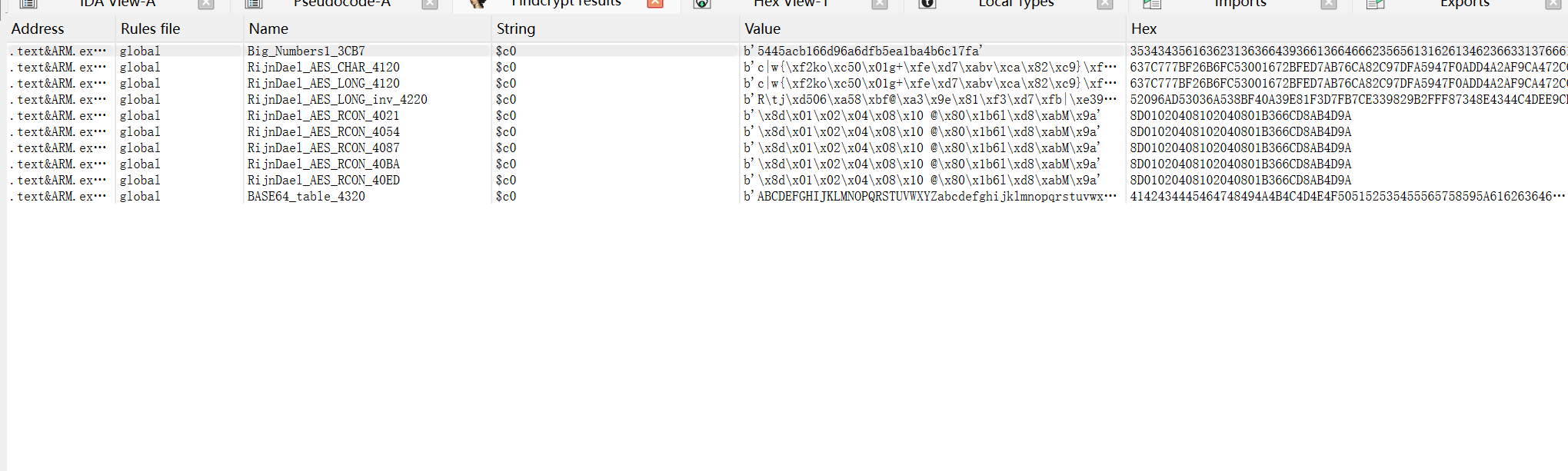 将修复过后的 so 文件拖到 ida 中看一下吧,发现现在就可以正常打开了,使用 ida 的插件 findcrypt 过一下