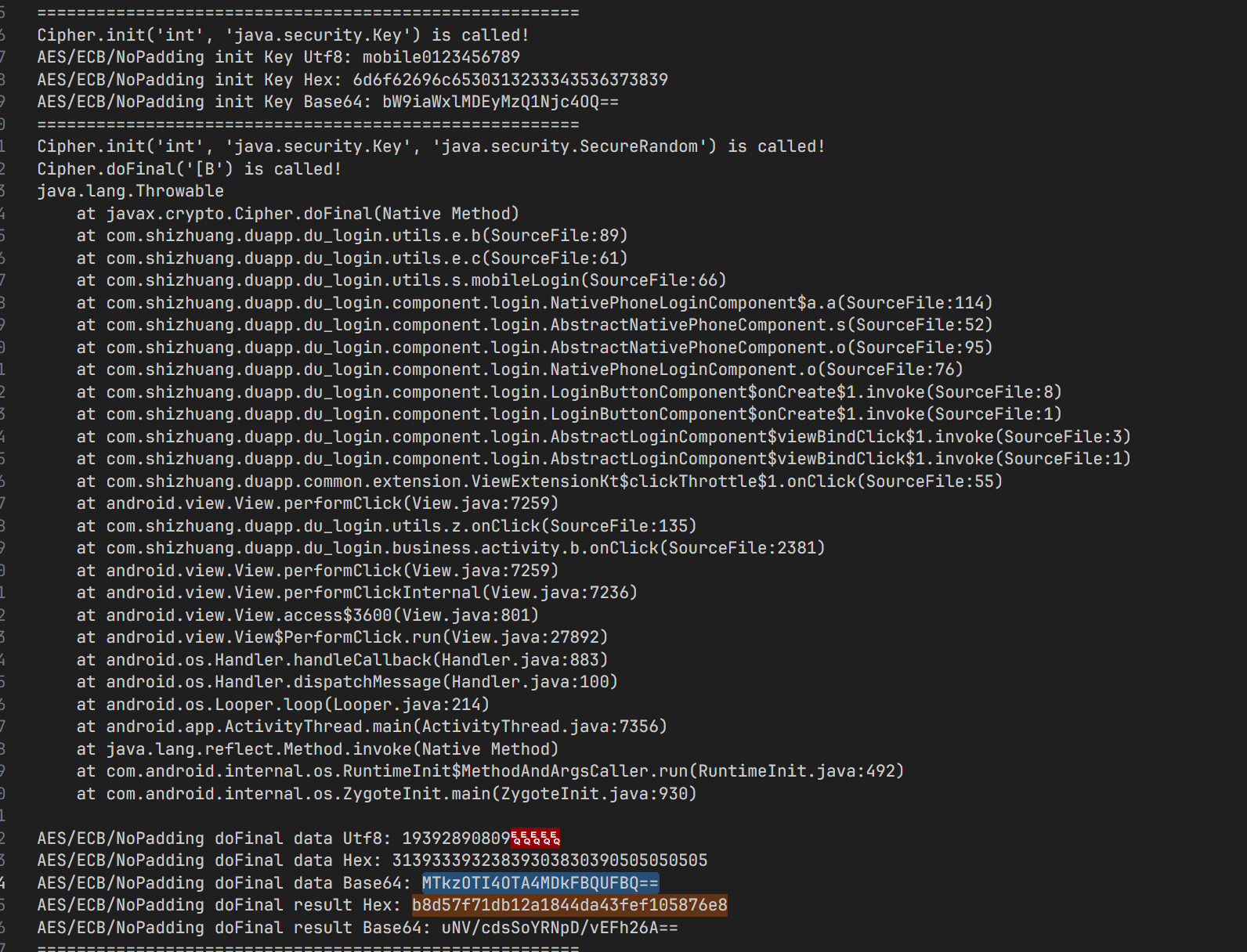 接着看一下 userName 和 password,这个直接在 Java 层加密的,之前的 hook 脚本就能够体现到