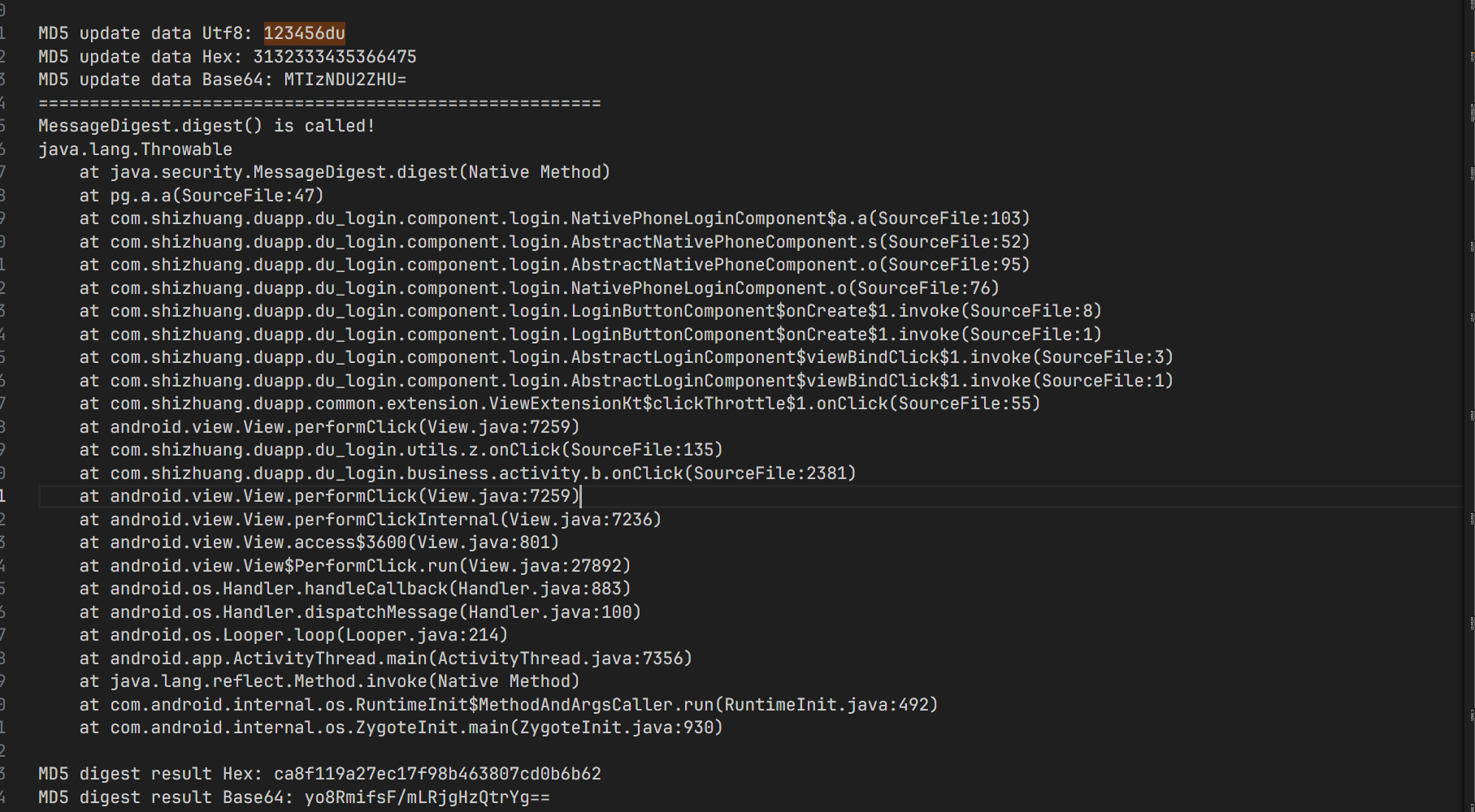 但是当我 hook 上去之后,发现并没有返回哪个 md5 值,那有没有可能是 so 层生成的一串密文,然后 Java 层得到这串密文进行的 md5 的结果呢?可以用 hook 脚本看一下是否在 java 层生成的 md5 加密结果