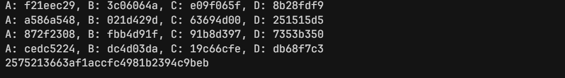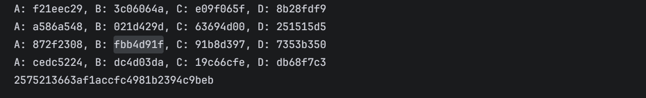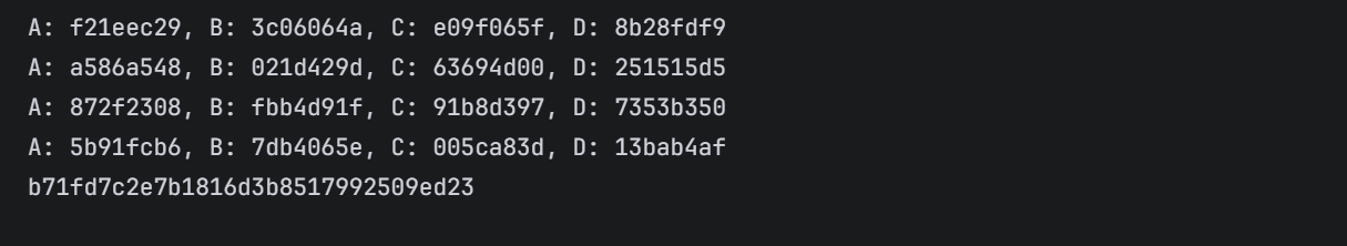 接着,我去 unidbg 打印一下魔改之后的 A,B,C,D 的值