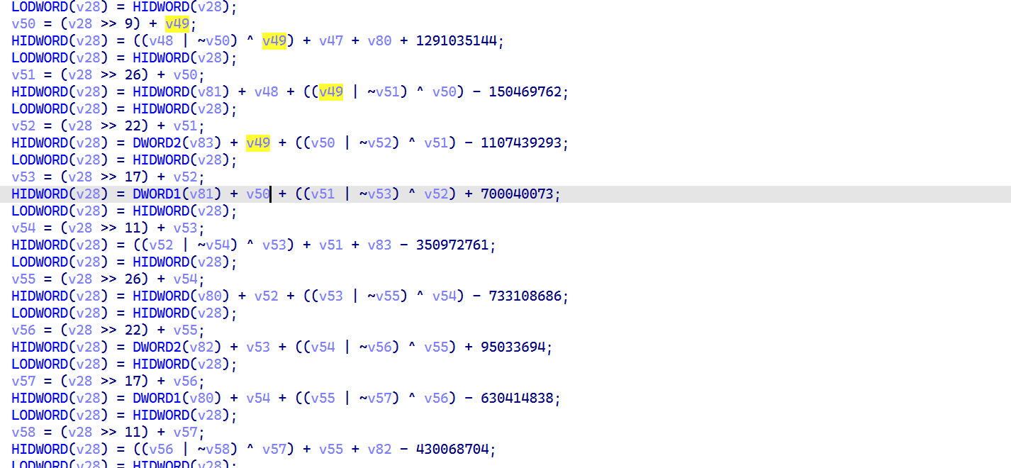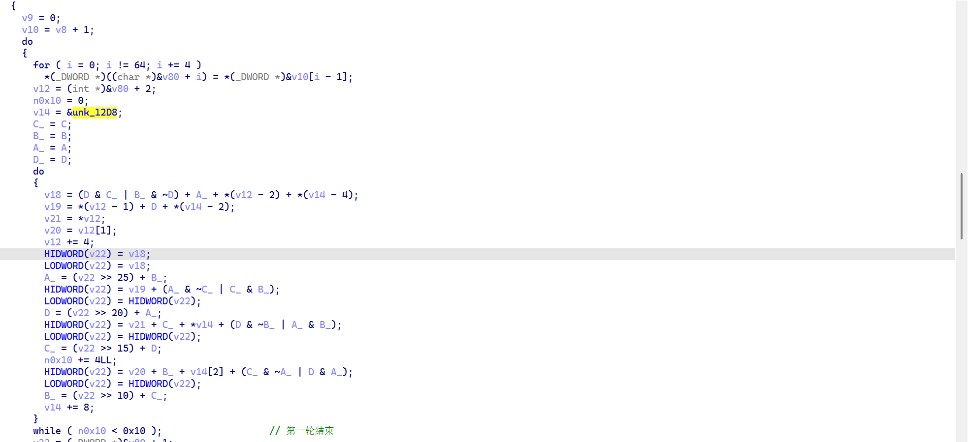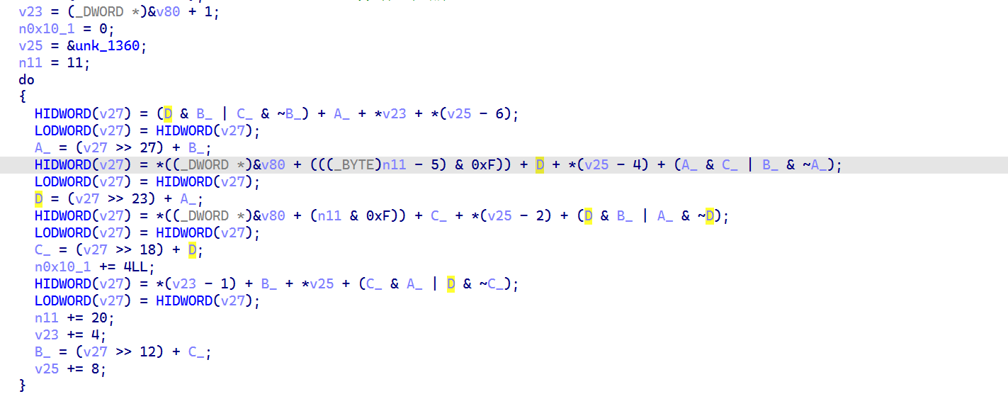 可以很清楚的看到非线性函数改了,第一轮应该是 FF 函数,他的非线性函数是: (b & c) | ((~b) & d) 被修改成了 (d & c) | ((~d) & b),但是这样不太好看,我选择在 unidbg 中打印寄存器的值